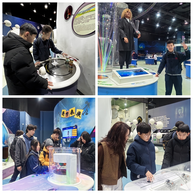 研学当日,同学们带着提前确定的研究主题,以小组为单位有序开展参观探究。在科技馆的各个展厅,大家穿梭于科技与人文的交融空间,将物理、生物、地理、信息技术等学科知识与展品互动深度结合。在智能科技展区,同学们围在机器人展台前,与灵巧的服务机器人对话互动,在一问一答间探索人工智能的运行逻辑;在 VR 体验区,大家戴上设备沉浸式穿梭于虚拟的科学场景,亲身感受科技带来的奇妙体验。参观过程中,同学们时而驻足记录实验数据,完成研学手册,时而围在一起探讨科学原理,在亲身体验中解锁科学的奥秘。