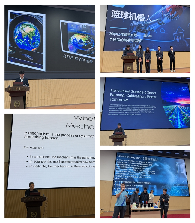 经过一周的整理沉淀,1月13日的成果汇报现场精彩纷呈。此次汇报活动在老师的悉心指导下,由学生会同学全程负责设计与组织,充分展现了出色的统筹协调能力。7 组学生依次登台,通过 PPT 展示、实验演示、现场采访等多元形式,分享了各自的研究成果。同学们的汇报内容详实,从航天科技到智能教育技术,从化学实验到物理机械,他们的表达非常自信,中英文自由切换,充分展现了学生们在研学实践中的收获与成长,赢得了师生们的阵阵掌声。