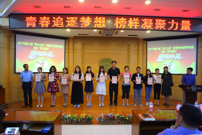 2017年5月19日下午,我校在阶梯教室举行了主题为“青春追逐梦想 榜样凝聚力量”的第十届“育才之星”优秀青年教师评选暨首届青年榜样颁奖典礼。共有36位教师在本次评比中获得了“育才之星”的各级各类奖项。为迎接我校八十周年校庆,本次表彰特别在前十届“育才之星”的获奖者中选出了十一位在各方面可以成为青年表率的优秀青年教师,特别向他们授予“青年榜样”这一奖项。他们是:李晨、赵杰、爱丹、宋巍、康琳、孙晓英、 张莹、贾春花、刘巍、郭丽云、黄婷婷。