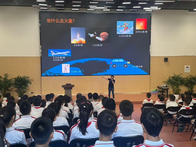 在“坐什么去火星?”的话题分享中,专家对比了火箭、卫星、飞机、汽车甚至步行等不同“交通工具”的速度,直观展现航天科技的速度优势,同学们不时发出惊叹,进一步激发了对航天科技的兴趣。
