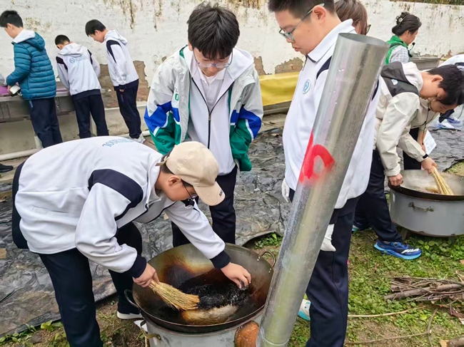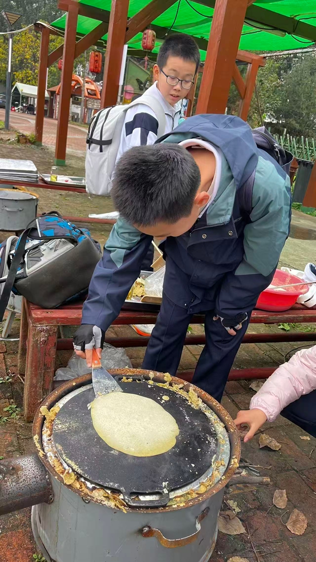 面对传统地灶,炒菜组的同学们迎来了一场不小的挑战。生火之初虽遇浓烟困扰,但大家群策群力,终于成功驾驭了这最原始的“厨房能源”。铁锅烧热,油花迸溅,同学们挥动锅铲,有模有样地烹饪起经典家常菜——木须肉与熬白菜。锅铲翻飞间,香气弥漫开来,最终呈现出几大盆色香味俱全的菜肴。