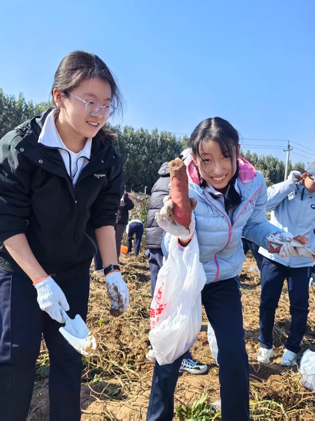 每一次下铲都充满期待,每当一个红薯破土而出,都会引来一阵惊喜的欢呼。从小心翼翼地探寻到成功收获的喜悦,同学们不仅收获了实实在在的食材,更体验到了劳动创造价值的纯粹快乐。有同学形象地比喻道:“挖红薯就像开盲盒,你永远不知道下一个有多大、是什么形状,太有意思了!”