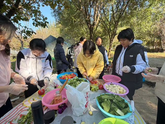 上午的活动在蝴蝶谷实践基地正式拉开帷幕。随着一声令下,各小组迅速进入状态,一场以“自己动手,丰衣足食”为口号的午餐制作竞赛温情上演。田间灶台旁,同学们各司其职,有条不紊:摘菜、洗菜、生火、和面……平日里手握笔杆的双手,此刻在食材与锅铲间同样忙碌而灵巧。在老师们的指导下,厨艺精湛的同学成为小组核心,大显身手;不擅烹饪的同学则主动承担辅助任务,尽心配合。整个过程中,互帮互助、彼此支持的场景随处可见,团队精神在烟火气中得到了最好地诠释。
