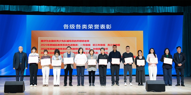过去一年,学校整体发展卓有成效,荣获“全国群众体育先进单位”“北京市教育工会先进教职工小家”以及“北京市基础教育课程建设先进校”等荣誉称号。在集体方面,学校一年级组、初三年级组、高三年级组获评“2025年西城区教育系统先进集体”。在个人荣誉层面,乔婷婷老师被评为“全国优秀少先队辅导员”,多位教师荣获“西城区教育系统优秀教师”“优秀教育工作者”及“我心中的好老师”称号。
