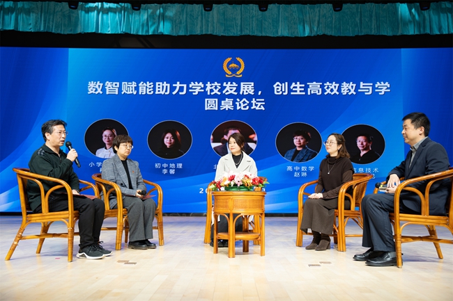 经验分享后,大会进入“圆桌论坛”环节。北京师范大学教育学部副部长、博士生导师余清臣教授受邀主持论坛,与前述四位发言教师围绕“人工智能在教育中的核心优势”“AI时代教师应具备的核心素养”等关键话题展开深度研讨。余教授凭借深厚的学术积淀引导对话深入,圆桌论坛思维碰撞激烈,台下教师专注聆听、深受启发。