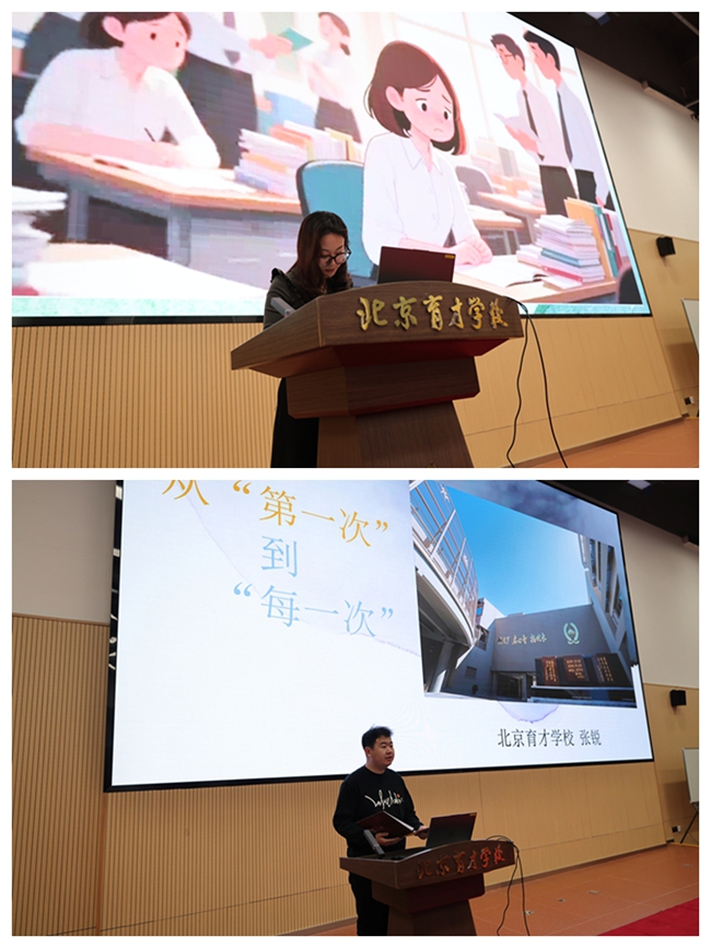 会议上,五位青年教师代表:堵周洁、薄涛、李鑫晔、张锐、张宇萱代表依次走上讲台,分享了自己在教育路上的探索与感悟。从初上讲台的紧张到如今的从容自信,从与学生的朝夕相伴到在团队教研中的专业突破,老师们用真挚的语言展现了他们在日常教学中的思考、实践与成长。他们的故事不仅体现了个人在教学能力、育人方式上的进步,更彰显了青年教师对教育事业的热情与担当,以及对学生成长的深切关怀。