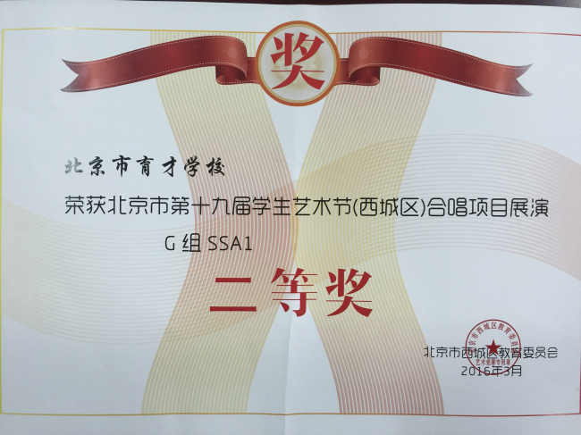 3月27日北京市第十九届学生艺术节西城赛区合唱展演在北京市第三十五中举行,初中部合唱队在马丽丽、梁愔两位老师的指导下参赛,取得了中学组SSA1组二等奖的好成绩。