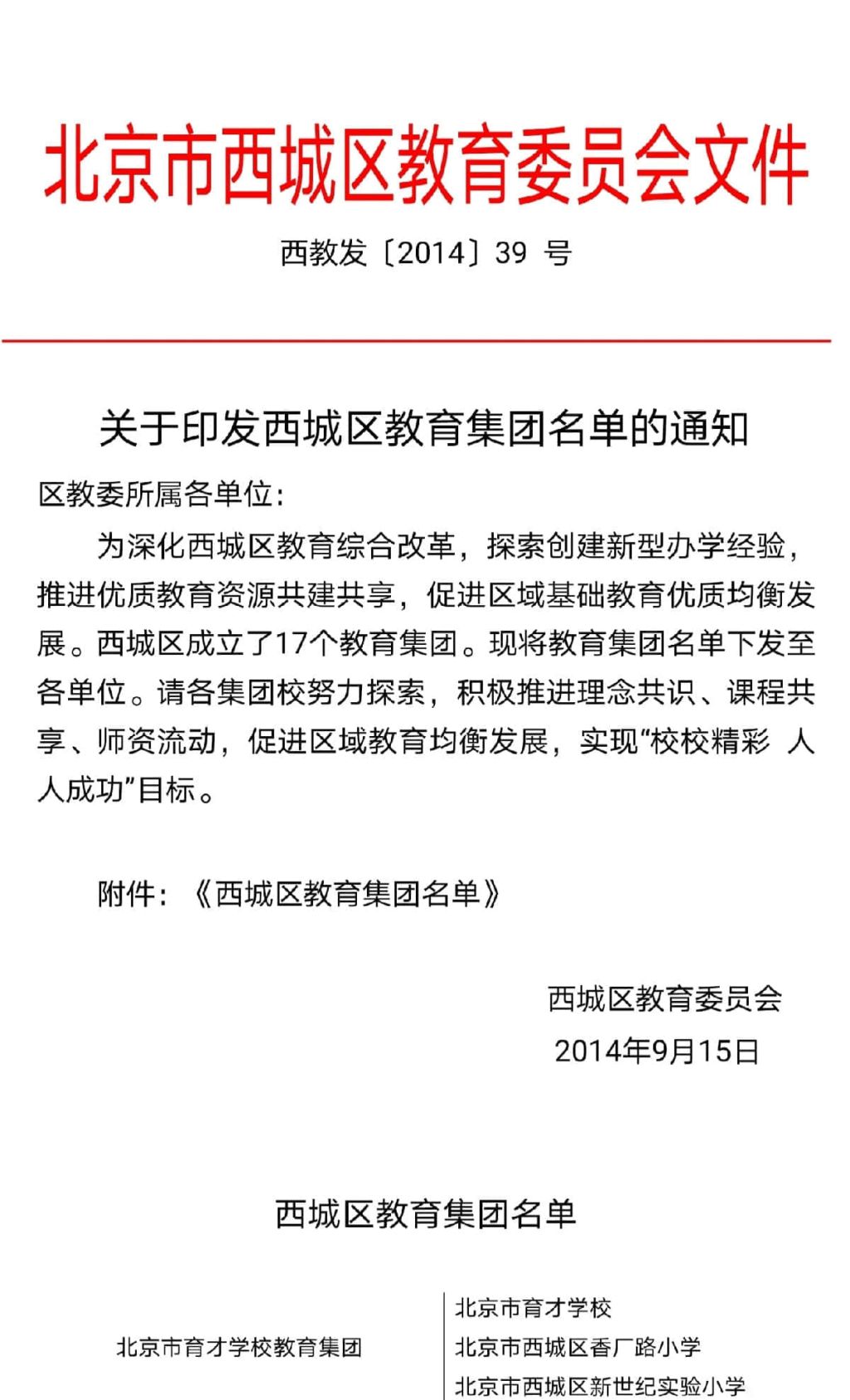 北京市育才学校教育集团成立,由北京市育才学校、北京市西城区新世纪实验小学、北京市西城区香厂路小学组成。后经西城区教委和房山区教委共同协商,将韩村河学区纳入集团管理。2017年10月,西城区教委对教育集团进行重新规划,又将徐悲鸿中学、虎坊路幼儿园纳入北京市育才学校教育集团。