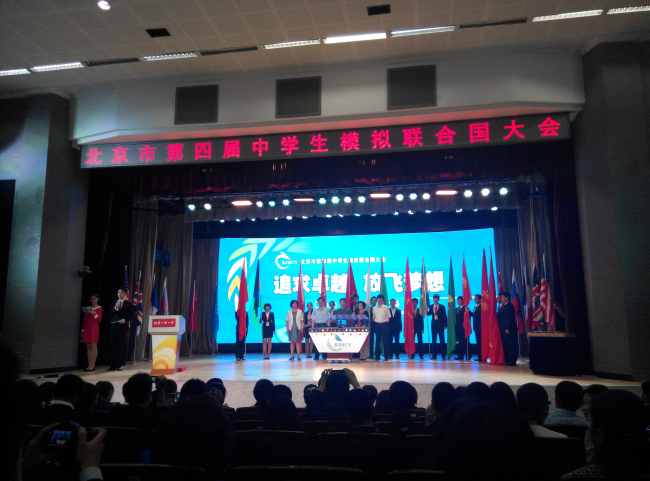 2014年9月12日至14日,我校高中部模拟联合国社团参加了由北京市教委、外交部新闻司共同主办的北京市第四届模拟联合国大会。大会主题为 “追求卓越 放飞梦想”(Chase for Better)。