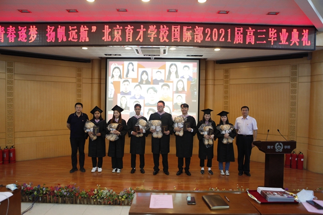 6月17日下午,以“青春逐梦 扬帆远航”为主题的北京市育才学校国际部2021届高三毕业典礼在阶梯教室隆重举行。因为还有部分国际学生因疫情原因未能返校,此次活动以腾讯会议为平台,线上线下同步直播进行。