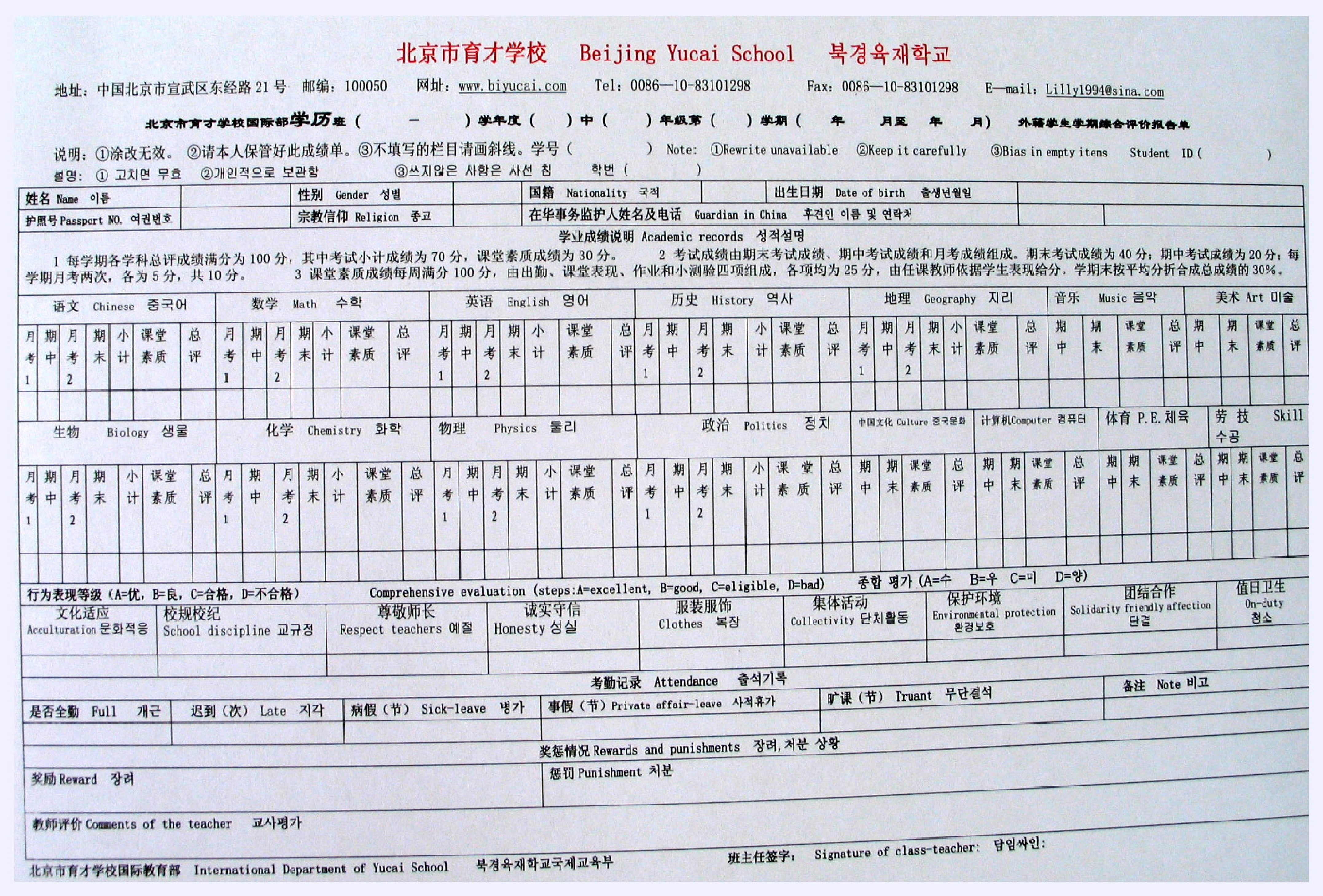 细致详尽的日常管理检查记录,促进学生养成良好的行为习惯。每一节课有任课教师对学生的课堂表现评价,每一天有班主任对学生的各方面行为表现评价,每周、每月有对学生的综合情况评价,并及时通报家长和监护人。
