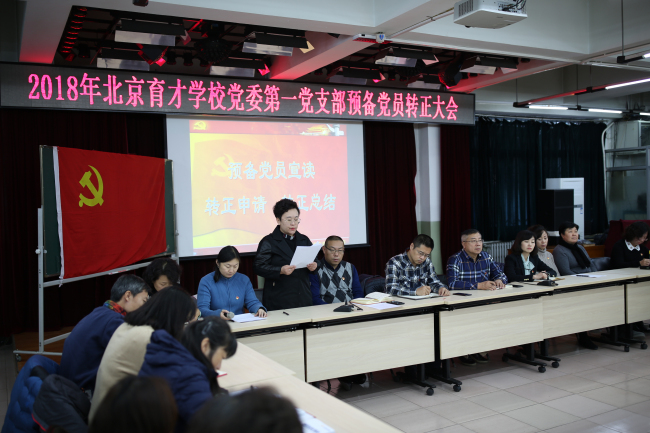 2018年12月18日下午,育才学校党委第一党支部全体党员在多功能厅召开了“2018年北京育才学校党委第一党支部预备党员转正大会”。