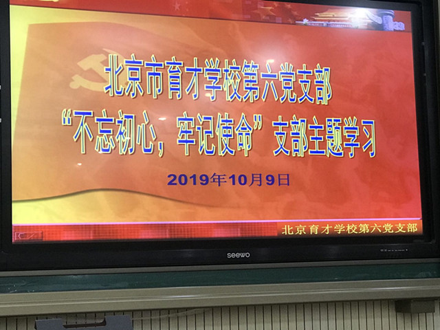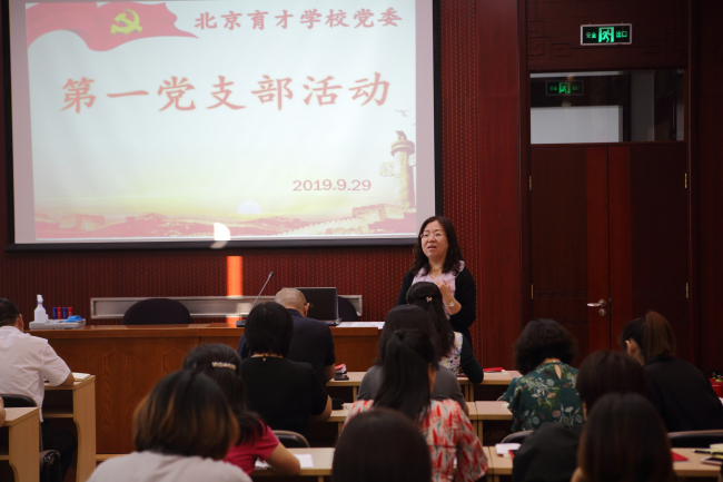 2019年9月29日下午3:40分,在即将迎来祖国七十华诞的日子里,北京育才学校党委第一党支部全体党员在校图书馆二楼党建活动基地,开展了新学期第一次支部活动。深入贯彻落实西城区教育系统和学校党委“不忘初心、牢记使命”主题教育活动之精神,本次活动中支部书记海国红同志采用微党课的形式,以“以初心铸魂教书育人,用使命鞭策自我提升”为主题和支部全体党员进行了交流。