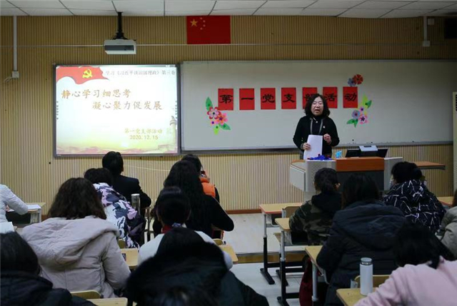 2020年12月15日下午,第一支部党员在小学录课室进行了党课学习。支部书记海国红同志以“静心学习细思考,凝心聚力促发展” 为题,结合对《习近平谈治国理政》第三卷的学习以及学部具体工作与支部全体党员进行了交流。