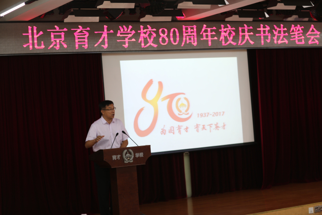 2017年9月28日,风和日丽,秋高气爽。“为国育才·育天下英才——庆祝北京育才学校80周年校庆书法笔会”在学校多功能厅隆重举行。中国书法家协会理事、北京书法家协会驻会秘书长、副主席田伯平;中国书法家协会理事、北京书法家协会主席孟繁禧;中国书法家协会理事、北京书法家协会主席、特级教师杨广馨;首都师范大学教授、中国书法家协会理事、北京书法家协会主席叶培贵;中国书画家联谊会副会长、北京书法家协会理事舒乃仁;中国书法家协会会员,北京师范大学艺术传媒学院教授虞晓勇;中国书法家协会会员,北京书法家协会理事、特级教师白彬华;首都师范大学书法专业教授、中国书法家协会会员赵宏;中国书法家协会会员、北京书法家协会理事方放,参加了此次育才80年校庆的庆祝活动。