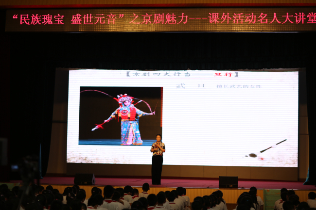 本次活动是对国粹文化与孩子们的节日完美整合;是城宫计划课程传授传统文化的大课堂;是学生学习成果展示的舞台。开场小学部田校长向全体学生致以节日的问候,提出让每一位学生成为传承民族传统文化的推进者,成为社会主义核心价值观的践行者,随后又把小学部根据社会主义核心价值观内容原创的连环画德育读本作为六一儿童节礼物送给了孩子们。随后,京剧专家——谭派第七代后人——谭小令老师进行名人大讲堂。谭老师介绍了中国戏曲常识,京剧的由来,京剧的历史脉络,京剧的重要组成部分——行当:生、旦、净、丑,还讲述了观剧礼仪。在介绍过程中穿插进行戏曲形体及京剧声腔示范,通过示范和播放相关视频资料,著名京剧艺术家连连登台,加之我校京剧社伙伴们的精彩课程学习内容的表演,将一场难忘的教育活动推向高潮。