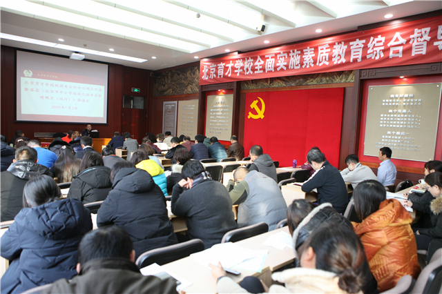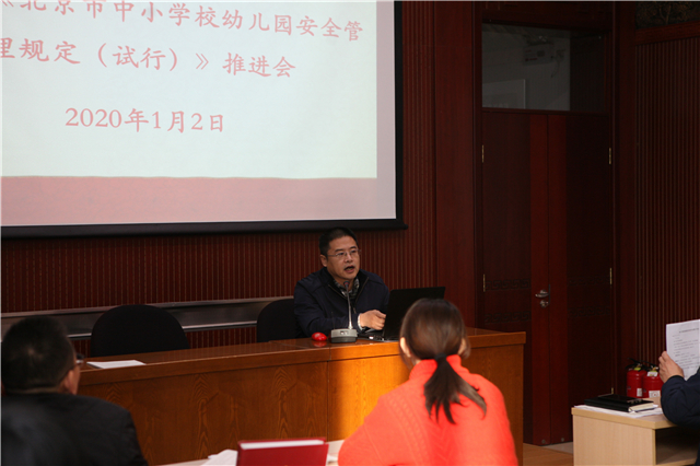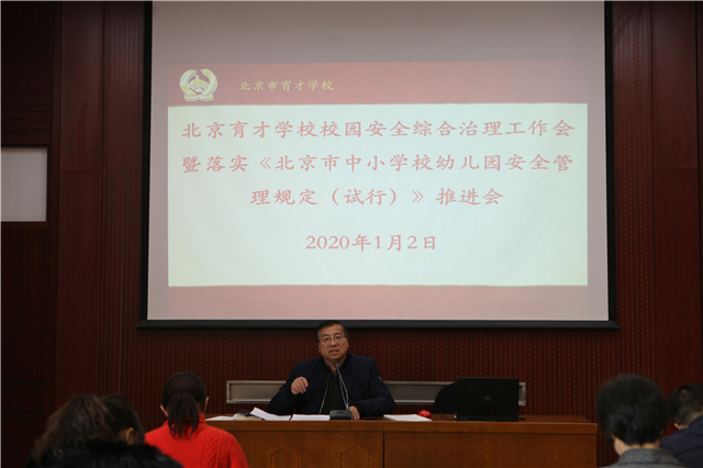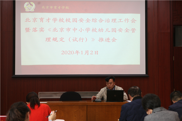 2019年1月2日,北京育才学校召开了“综合治理安全工作会”。学校党政主要领导、班子成员,以及学校安全工作相关干部、教师和工作人员参加了会议。党委齐建军书记主持会议,并首先传达了区教育系统安全工作会的精神,同时就我校综合治理工作提出了指导意见和要求。随后武宏韬副校长就新颁布的《北京市中小学幼儿园安全管理规定》进行了解读和说明。桑春茂校长结合这一规定就校园安全工作进一步提出了意见和要求。最后纪委朱霞书记通报了违反“八项规定”的几起典型案例。