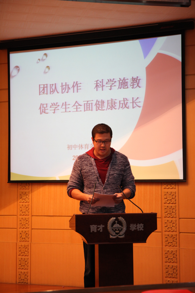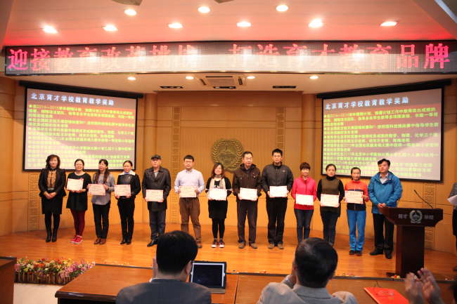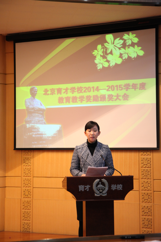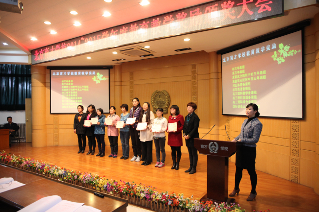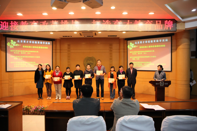 10月23日,在阶梯教室召开了北京育才学校2014—2015学年度教育教学奖励大会。过去一个学年中在教育教学方面取得突出成绩的个人和集体受到了学校的表彰。小学部张颖老师向大家介绍了“敬先农·爱本草”特色课程的开发和取得的成果。初中体育组刘旸老师和大家分享了近几年来初中体育备课组取得成功经验。高中部赵俊祯老师把自己近几年坚持在高三一线的教育教学心得介绍给大家。“F1进校园”科技挑战赛的学生团队也向老师们展示了他们的风采。