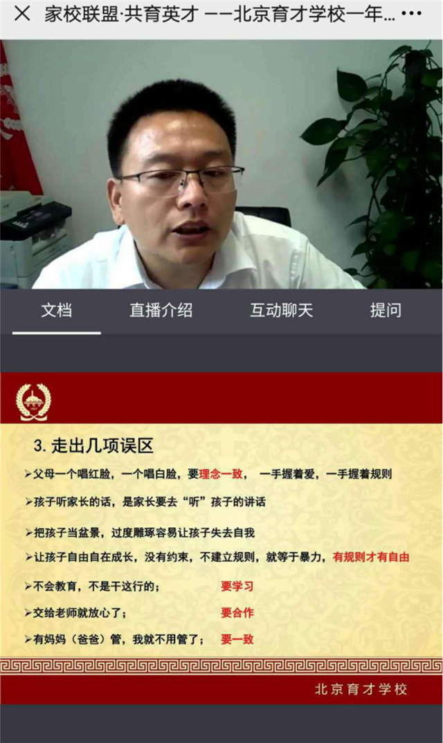 8月29日下午,召开了以“家校携手 共育英才”为主题的线上家长培训。会上,首先由齐建军书记介绍了面向全校服务的校级干部和小学管理团队,以便今后家长遇到问题能够找到相关负责领导及时进行沟通。随后,朱绪兵副校长进行了主题为《家校携手共育英才》的培训。语文、数学、英语三位教研组长依次发言,帮助家长了解学科任务,明确怎样帮助学生养成良好的学习习惯。最后,年级组长李晨老师向家长们介绍了面对疫情年级组的工作安排,同时也就《一年级新生入学手册》做了细致的解读,帮助家长进一步明确了各项要求。