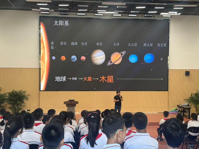 讲座伊始,陆总设计师借助大屏幕展示的火箭发射、太阳系行星等丰富画面,带领同学们开启航天探索之旅。从太阳系的构成,到地球、月球、火星、木星等天体的关系,专家用通俗易懂的语言,为同学们揭开宇宙的神秘面纱,同学们个个听得聚精会神,眼中满是对浩瀚宇宙的好奇与向往。