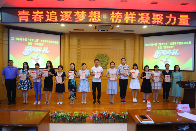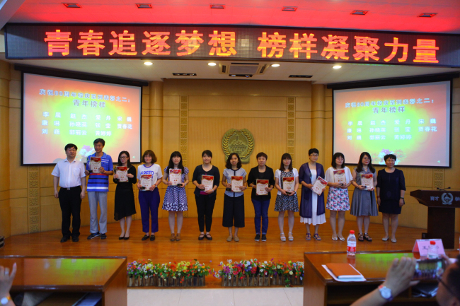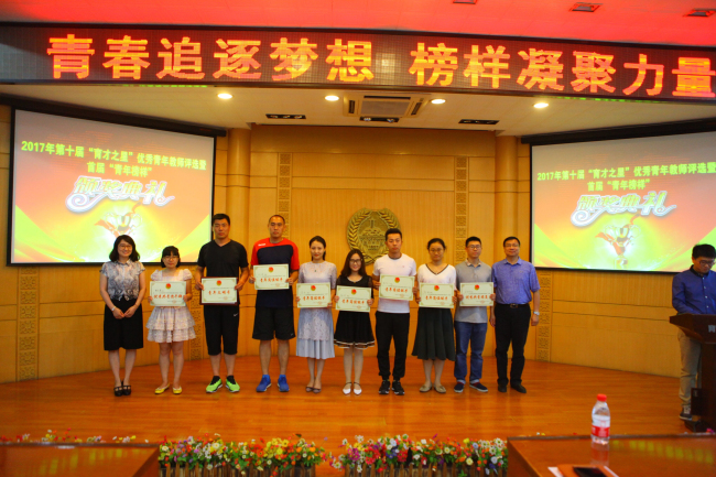 2017年5月19日下午,我校在阶梯教室举行了主题为“青春追逐梦想 榜样凝聚力量”的第十届“育才之星”优秀青年教师评选暨首届青年榜样颁奖典礼。共有36位教师在本次评比中获得了“育才之星”的各级各类奖项。为迎接我校八十周年校庆,本次表彰特别在前十届“育才之星”的获奖者中选出了十一位在各方面可以成为青年表率的优秀青年教师,特别向他们授予“青年榜样”这一奖项。他们是:李晨、赵杰、爱丹、宋巍、康琳、孙晓英、 张莹、贾春花、刘巍、郭丽云、黄婷婷。