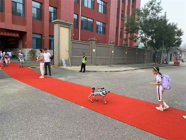 育才学校北纬路校区大门前,中国移动机器人一大早就来参与迎新——人形机器人“小新”博士挥舞手臂欢迎师生们返校,四足机器狗与学生们热情互动,迎宾机器人载歌载舞,为师生们送上新学期的惊喜。