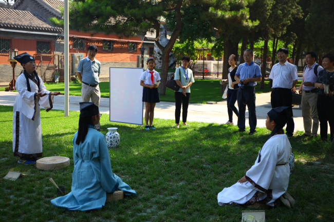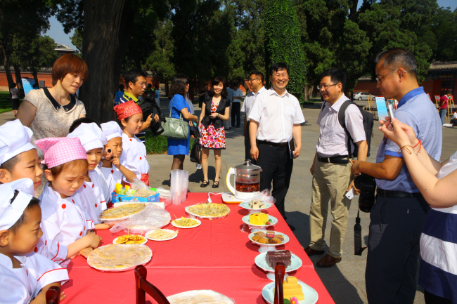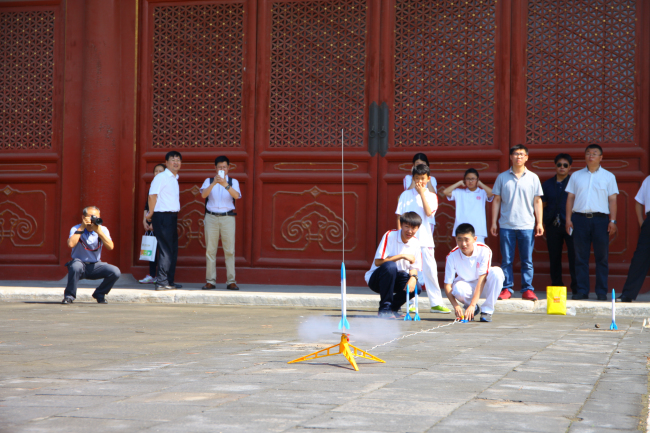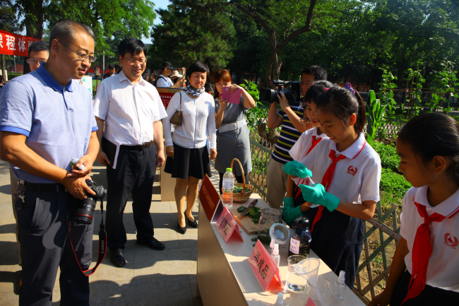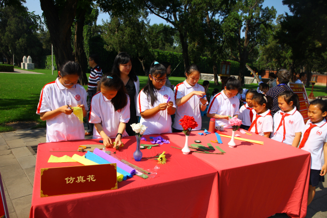 第二部分是由小学和初中的部分师生展示了学校丰富多彩的校本实践体验课和学生自主选修课及小课题研究成果。当年皇帝的“一亩三分地”,如今是孩子们的本草试验田。小学部师生为来宾展示了异彩纷呈的先农本草系列活动:学生们把刚刚采摘的薄荷、紫苏、穿心莲等分享给了来参观的各位老师和家长们;还结合科学、语文、数学、英语学科为来宾讲解五谷知识,带领来宾制作五谷标本,品尝五谷食品;并制作五彩丝线粽、驱蚊香包献给来宾。初中学生们有的把自己制作的纸塑花和剪纸献给来宾、有的讲解他们在智慧校园、DI创意、科技创新等方面的研究小成果、有的现场调试赛车及表演遥控赛车和自制的“火箭”发射,展示现场人头攒动,热闹非凡。学生们认真专业的讲解,细致精美的手工制作,奇思妙想的创意都给来宾们留下了深刻的印象。
