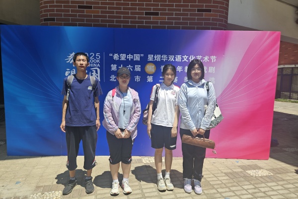 2025年6月8日,育才学校高中外语组教研组长边业凝老师、高二英语备课组杨洁老师、谢艳霞老师、施勇老师、梁玉晴老师带领13名高二学生,参加了2025年第十六届“希望中国星熠华“双语文化艺术节—北京市第二赛季决选。活动自2025年3月份启动以来,收到了北京市各中小学幼儿园近两百余部作品,包含中英文经典剧、原创剧、课本剧、音乐剧多语合唱等,5月份经过视频评审,我校英文经典剧《茶馆》在众多作品中脱颖而出成功入围现场决选。