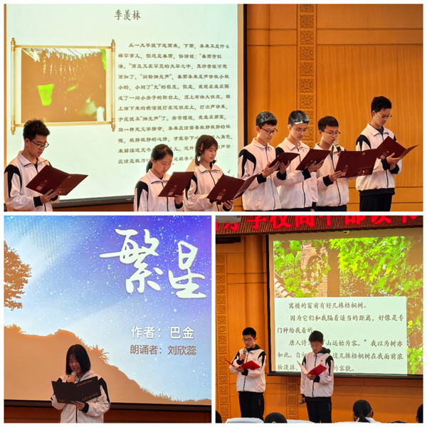 2024 年 12 月 10 日,北京育才学校高中部在阶梯教室成功举办了“书卷满庭芳·阅启新征程”——2024年读书节朗诵展示活动。本次活动旨在进一步激发学生的阅读兴趣,提升文学素养,营造浓厚的校园书香氛围。寿延校长、张莹主任、贺卫军主任以及高一年级、徐特立班全体学生共同参与了此次盛会,共享了一场精彩纷呈的文学与朗诵的盛宴。 活动伊始,一段精心制作的暖场视频吸引了全场的目光。视频回顾了开学以来各班读书节活动的精彩瞬间,包括心桥读书社的成立、各班精美的图书角、好书推荐展板,以及语文组老师精彩的阅读讲座,那些充满激情与专注的画面,不仅展现了同学们对阅读和朗诵的热爱,也为本次展示活动拉开了富有温情与回忆的序幕。 在热烈的掌声中,主持人高一8班张晨依同学和高一5班刘承卓同学款款登场,他们以稳健的台风和富有感染力的开场白,正式开启了朗诵展示环节。本次朗诵会分为“家国责任”、“自然感怀”“青春成长”三个板块: 在“家国责任”单元,高一4班同学带来的独诵《用残损的手掌》率先登场。朗诵者用深沉而饱含情感的声音,将诗人对祖国深深的眷恋与对侵略者的愤恨表现得淋漓尽致。高一5 班的集体朗诵《回延安》则以其热烈奔放的情感和整齐有力的节奏,将对革命圣地延安的思念与热爱之情抒发得酣畅淋漓。高一6 班的独诵《延安颂》,以悠扬的语调、庄重的情感,歌颂了延安这片土地的神圣与伟大。高一 9 班同学则别出心裁地选取了《大江大河》经典台词进行朗诵,通过演员们富有感染力的演绎,将剧中人物在时代浪潮中的拼搏与奋斗展现得生动形象,让同学们深刻体会到了改革开放时期人们追逐梦想的艰辛与执着。 在“自然感怀单元”,徐特立班的独诵《繁星》如同一股清泉,流淌在听众的心间。朗诵者用轻柔而空灵的声音,描绘出繁星闪烁的夜空下,诗人对自然、对生活、对母亲的细腻情感与深邃思考。高一 1 班的《梧桐树》以独特的视角和优美的语言,借梧桐树的形象抒发了对时光流逝、生命成长的感悟。高一8 班的《听雨》在淅淅沥沥的雨声背景音中展开,朗诵者们用细腻的情感和多变的语调,描绘出听雨的心境与感受。 在“青春成长”单元,高一7 班的《匆匆》紧扣时间这一主题,朗诵者以急切而又略带惆怅的语气,诉说着时光匆匆流逝的无奈与珍惜时间的重要性。高一2 班带来的《这是四点零八分的北京》,生动地再现了知青下乡时离别的场景与复杂的情感,将知青们对故乡的不舍、对未来的迷茫表现得淋漓尽致。高一 3 班的《这也是一切》则充满了对未来的希望与信念,朗诵者们用激昂有力的声音,传递出积极向上的力量。 活动的最后,心桥读书社全体同学以一首气势磅礴的《相信未来》为本次朗诵展示活动画上了圆满的句号。他们用坚定而充满信心的声音,表达了对未来的美好憧憬与无限期待,将全场的气氛推向了最高潮。 朗诵结束后,语文教研组组长姚继辉老师登台进行了精彩点评。姚老师对同学们的表现给予了高度评价,从朗诵技巧、情感表达、作品理解等多个方面进行了细致的分析与指导,肯定了同学们在朗诵过程中展现出的文学素养与艺术感染力,同时也提出了宝贵的建议,鼓励同学们在今后的阅读与朗诵中不断进步,更好地领略文学的魅力。 随后,高一 1 班梅矞鑫同学怀着对学校与心桥读书社的深厚情感,将自己亲手篆刻的印章郑重地赠予学校,由寿延校长欣然接受。这方印章不仅仅是一块刻有文字图案的石头,它凝聚着梅矞鑫同学的心血与才华,更象征着学生对校园文化建设的积极参与和独特贡献,为本次读书节活动增添了一抹别样而动人的色彩。 随后,张莹主任进行了总结发言。张主任首先对高一语文组老师们在读书节活动中全心付出和倾力指导表达了诚挚的感谢与敬意。她强调阅读对于个人成长和学校文化建设的重要性,希望同学们以此次读书节活动为契机,养成热爱阅读的良好习惯,让心灵沉静下来,在阅读中不断成长和进步。 本次读书节朗诵展示活动不仅为同学们提供了一个展示自我的平台,更激发了他们对阅读和朗诵的热爱,在校园内掀起了一股读书热潮。相信在“书卷满庭芳 阅启新征程”的引领下,高一年级的学子们将在阅读的道路上不断前行,开启更加精彩的知识之旅,用书香浸润心灵,用智慧点亮未来。