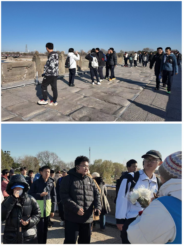 午后的阳光洒在卢沟桥的石板上,800余年的古桥见证着岁月的变迁,也铭刻着民族的抗争。同学们踏上桥面,触摸着历经风雨的石狮子,聆听着1937年“七七事变”爆发时的历史细节,当听到29军将士以“大刀精神”奋勇抗敌的事迹时,不少同学眼中泛起了泪光。在宛平城城墙下,墙体上深浅交错的弹坑清晰可见,这是侵华日军暴行的铁证,也成为激励后人自强不息的精神印记。
