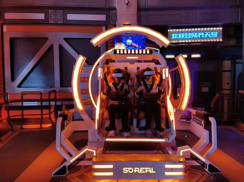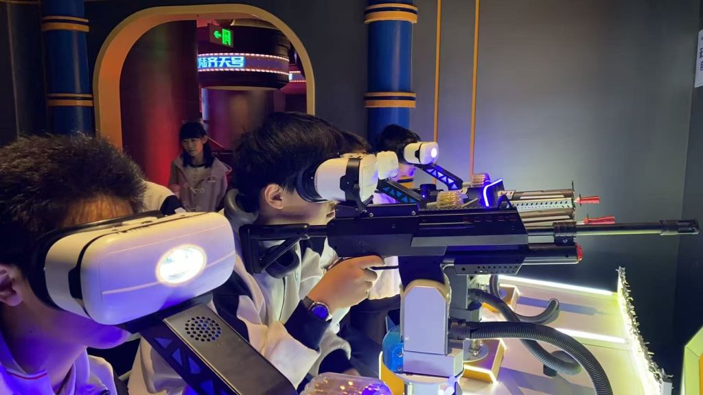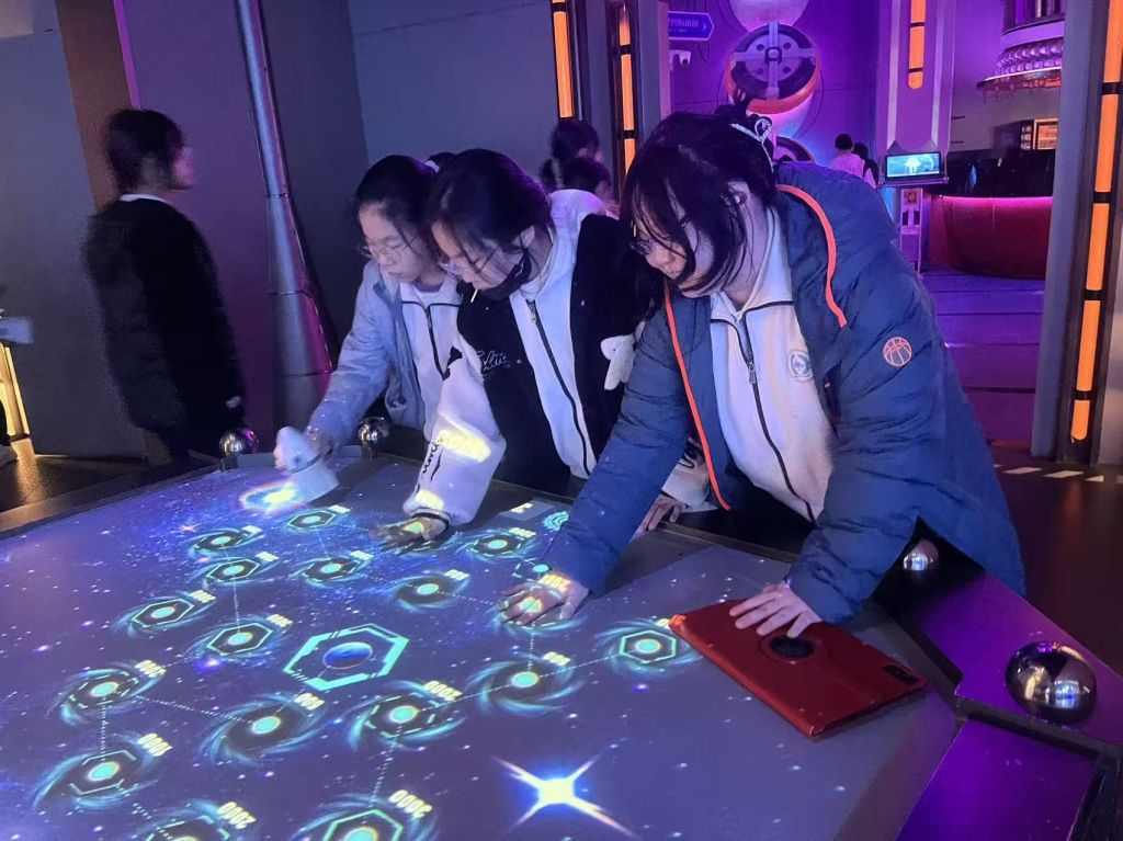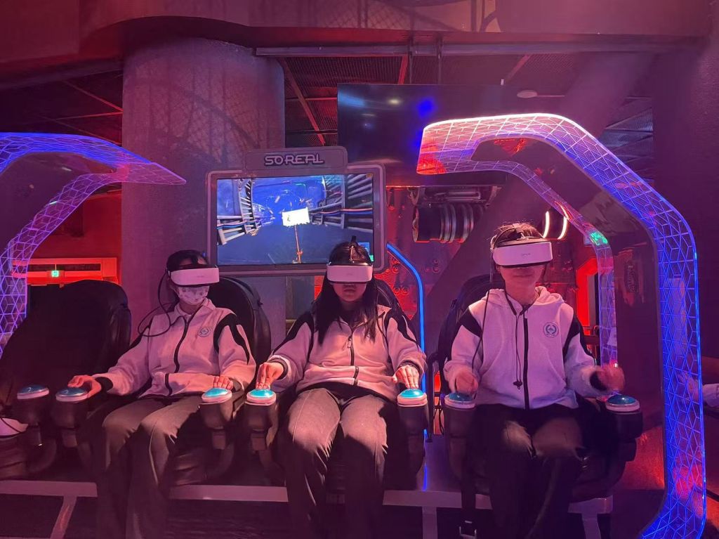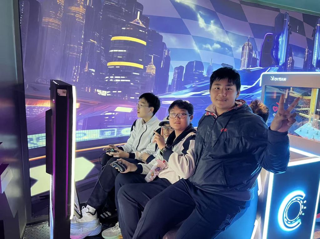 本次实践的核心环节——AI智能体验,点燃了同学们的探索热情。在VR沉浸式体验区,同学们戴上设备,穿梭于星际宇宙、虚拟场景,沉浸式感受VR、AR等前沿技术带来的震撼体验。“陨星迷航”项目中,大家操控飞船躲避星际障碍,在紧张刺激中体验航天仿真技术的硬核实力;“银翼领航”项目里,反复尝试熟练操控“战机”翱翔,每一次成功都满是成就感。此外,AI数字人导览、智能交互机器人等互动项目,让同学们在趣味体验中深入了解AI在文旅、服务等领域的应用场景。
