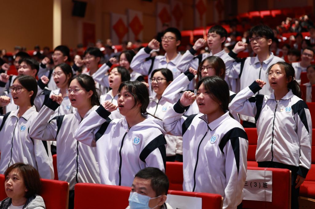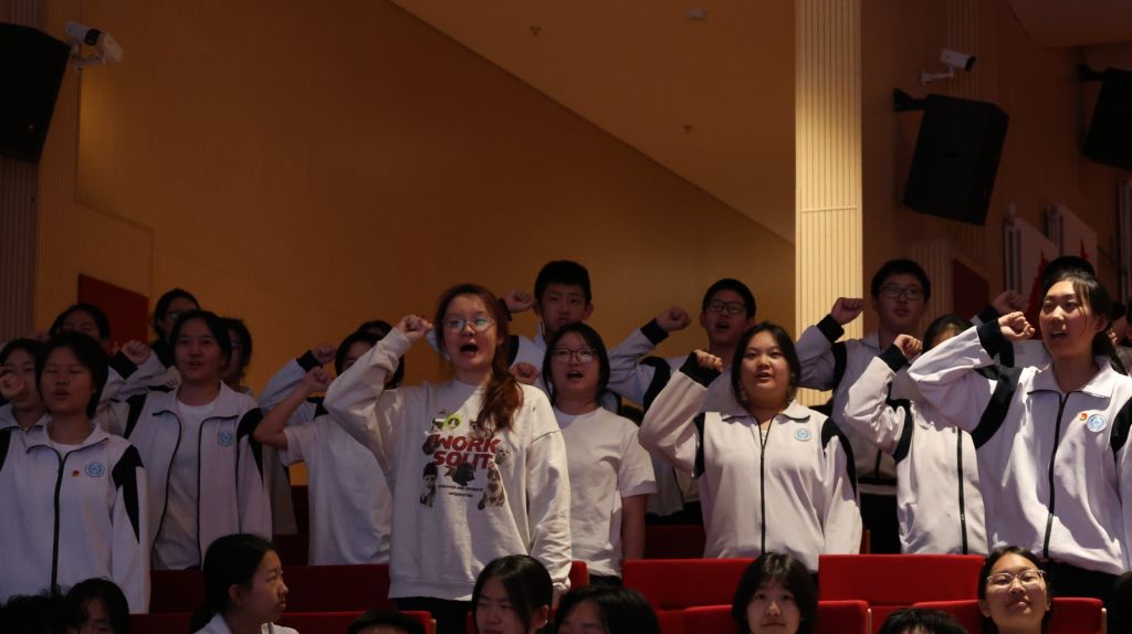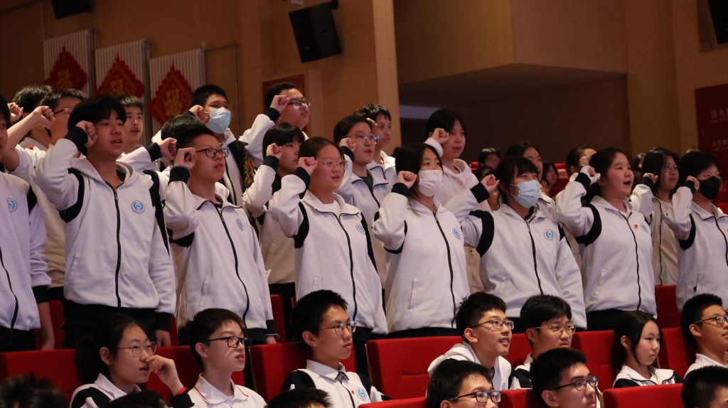 庄严的誓师环节,将整场大会的氛围推向了激昂的高潮。各班同学全体起立,举起右手,以最昂扬的姿态喊出誓言。学子们以青春为名,誓师如雷,声震云霄。一句句誓言掷地有声,一腔腔热血滚烫胸膛,少年们的壮志豪情响彻校园。